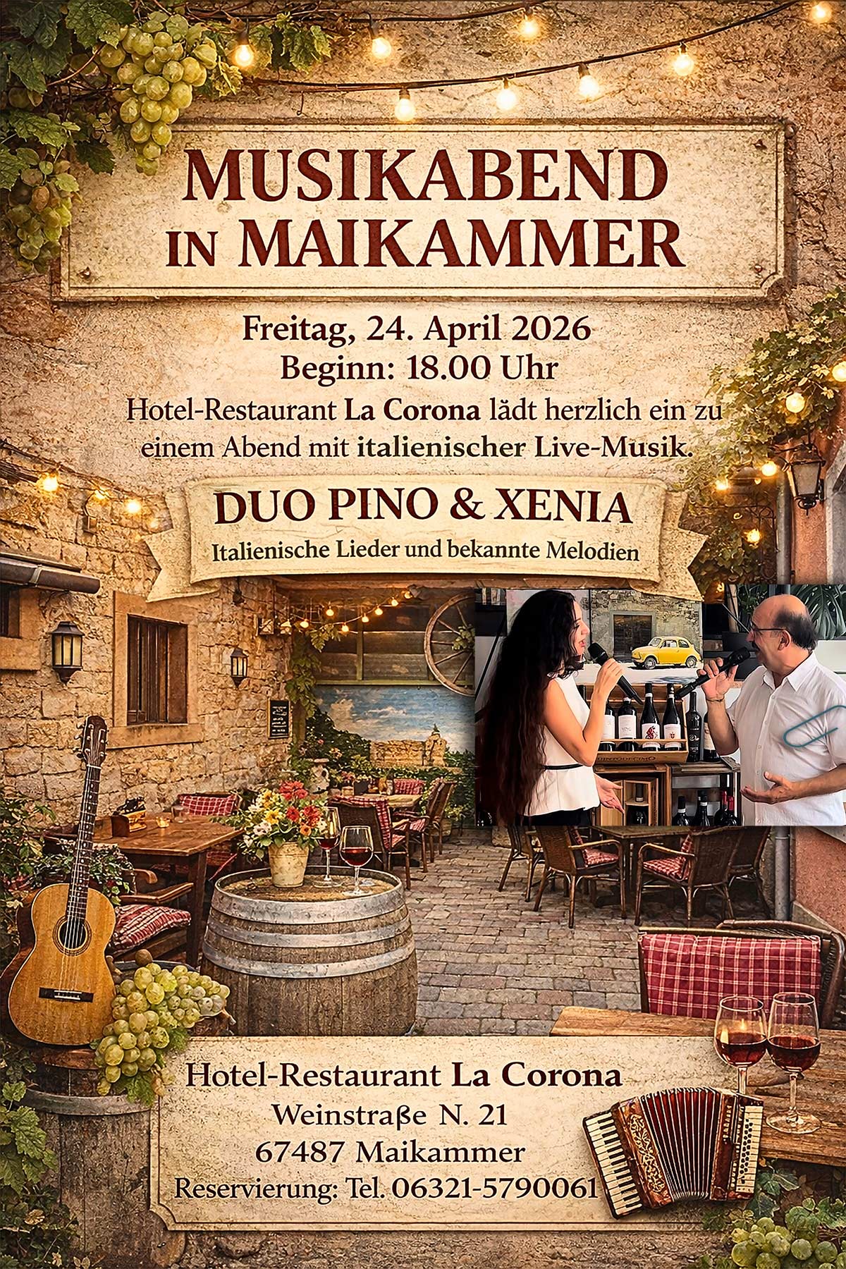Das Hotel Restaurant La Corona in Maikammer liegt dicht am Mittelpunkt der Deutschen Weinstraße in der Pfalz. Es ist ein familiär geführtes italienisches Restaurant mit Gästezimmern.